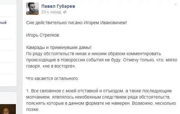 Зато уточнил, что появившееся на его страничке послание от Игоря Стрелкова — не фейк. И Стрелков совместно с Губаревым готовят всем большой сюрприз, которого никто не ждёт..