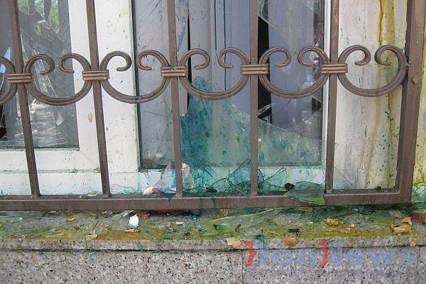 Кирпичи и камни кидали так метко, что почти все окна на втором этаже как со стороны Халтуринского и Социалистической, оказались разбиты. Корреспондент donnews.ru насчтиал 16 разбитых окон.