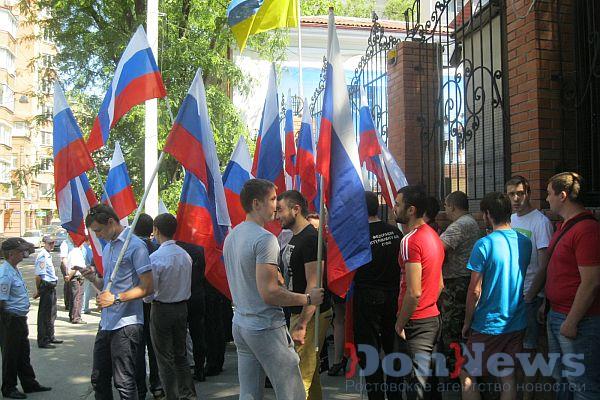В субботу утром, 13 июня, спустя 9 часов после нападения на Генконсульство Украины в Ростове у разгромленного здания дипмиссии состоялся митинг. В мероприятии приняли участие студенты двух ростовских колледжей — связи и автодорожного, и группа гражданских активистов. Все около ста человек, с учётом зевак и многочисленной пишущей и снимающей братии.