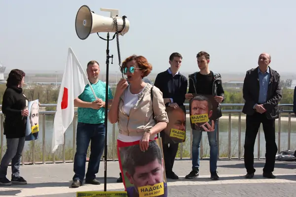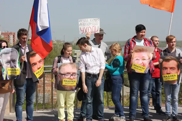 Митинг начался в 14:00, как и планировалось. Участники держали в руках портреты президента, премьера и других политических деятелей с заклеенными ртами и надписью «надоел». Нашлось в рядах «надоевших» место и губернатору Ростовской области Василию Голубеву.