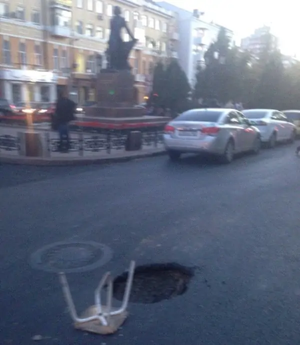Заботливые автолюбители загородили провал в асфальте стулом.