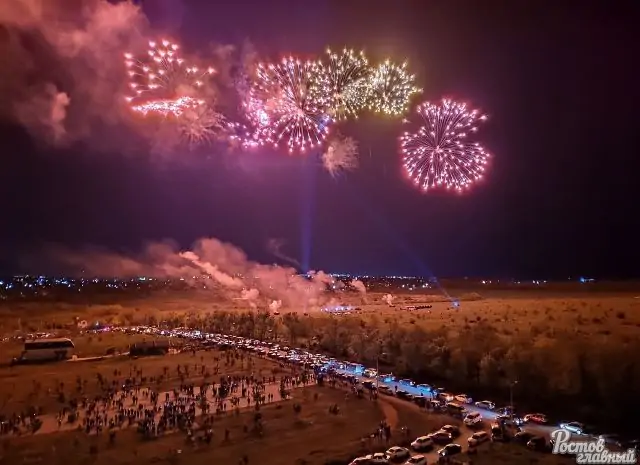 Праздничный фейерверк и салют начались ровно в 22:00 и продлились около 10 минут. За это время в небе над Театральной площадью ростовчане увидели 800 вспышек, каждая из которых имеет своё название: «Золотая парчовая корона с опадающими красными листьями», «Красно-голубой Сатурн», «Золотая волна, переходящая в ярко-красные метеоры», «Белые хризантемы, переходящие в красные, жёлтые, зелёные звёзды», «Пурпурные пионы» и другие.