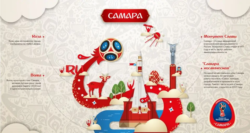 В символике Москвы легко угадываются знаменитые собор Василия Блаженного и Спасская башня Кремля. Самару символизирует ракета-носитель «Союз», которую разработали в этом городе.