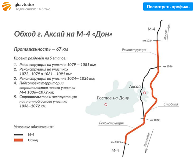 Что касается обхода Аксая, то речь идёт о его пятом, основном, этапе. В рамках первых трёх идёт реконструкция четырёх существующих участков М4 «Дон» — 1024-1036 км, 1072-1079 км, 1079-1081 км и 1081-1091 км. Эти работы должны быть завершены до конца 2020 года.