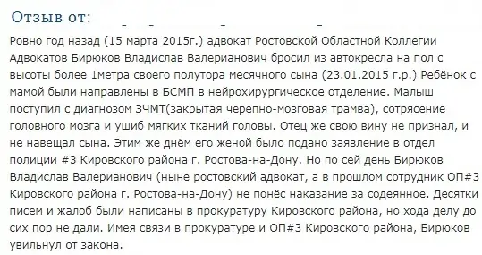 «Ребёнка госпитализировали с закрытой черепно-мозговой травмой, сотрясением мозга и ушибом мягких тканей головы. Владислав не признал своей вины. Было подано заявление в полицию Кировского района, а позднее несколько жалоб в прокуратуру, однако ход делу таки и не дали», — писала она.