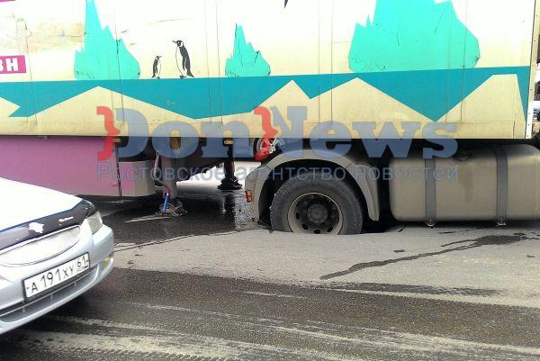Дорожно-транспортное происшествие на Гвардейской площади в Ростове случилось в понедельник, 29 июня, около 14:30. Под многотонной фурой Mercedes, гружённой молочной продукцией, провалился асфальт. Водитель автомобиля в разговоре с корреспондентом donnews.ru так описал ситуацию: