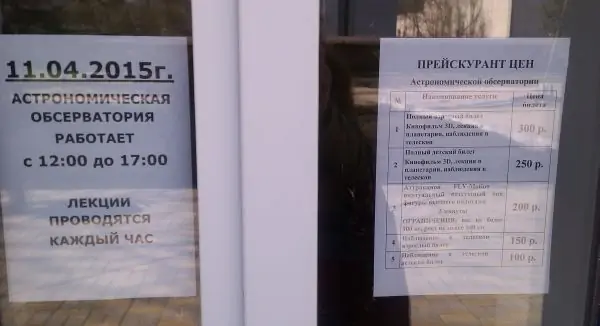 Чтобы полюбоваться звёздным небом, посмотреть фильм и прослушать лекцию, взрослому придётся заплатить за вход 300 рублей, а ребёнку — 250 рублей.