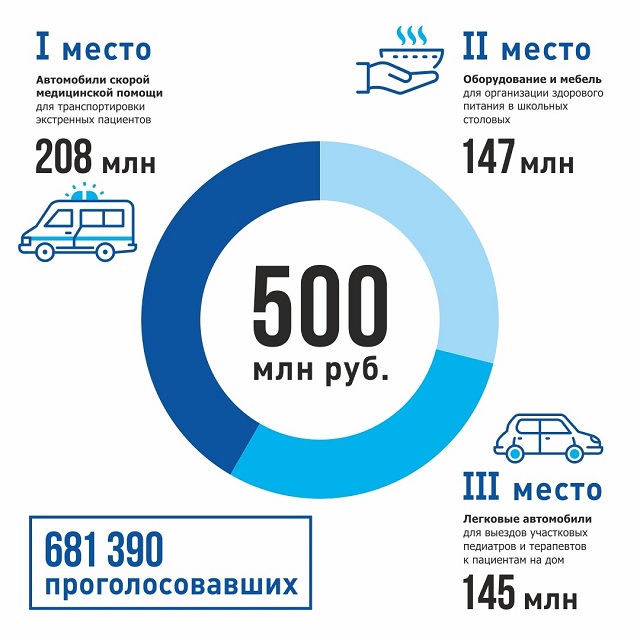 По словам Василия Голубева, исходя из итогов голосования бюджетные средства будут распределены следующим образом: 200 миллионов рублей будут направлены на закупку 60 машин скорой помощи; более 147 миллионов потратят на приобретение оборудования и мебели для школьных столовых; почти 145 миллионов рублей выделят на транспорт для участковых врачей. На эти деньги планируется приобрести 150 новых автомобилей.