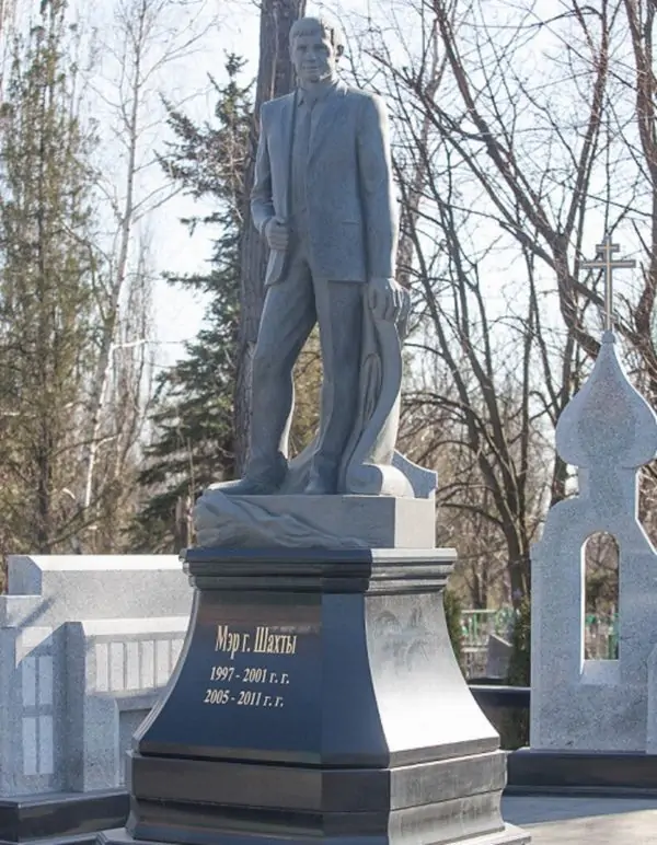 Памятник убитому мэру Шахт виден на городском кладбище издалека— фигура градоначальника выполнена в полный рост. Высота скульптуры более 1,8 метра — Сергей Анатольевич в строгом костюме и улыбкой на лице смотрит вдаль.