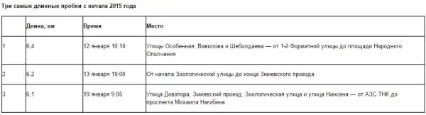 В текущем же году сервис «Яндекс.Пробки» зафиксировал 10-балльные пробки лишь однажды. Это произошло в первый рабочий понедельник января, после снегопада. В этот же день была зафиксирована самая длинная пробка, которая растянулась на 6 километров с лишним по улицам Особенной, Вавилова и Шеболдаева, от 1-й Форматной улицы до площади Народного Ополчения.