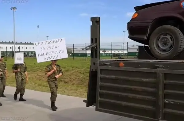 Руководство части, в которой служит военный, решило устроить для его коллег показательный флешмоб. Разбитую легковушку погрузили на эвакуатор и медленно провезли перед личным составом части. За грузовиком в «траурной процессии» прошли военнослужащие с плакатами, на которых были написаны лозунги. Один из них: «Сел пьяный за руль — вылетел из армии!». Следом за разбитой машиной военнослужащие пронесли плакаты с фотографиями, на которых были показаны последствия ДТП.