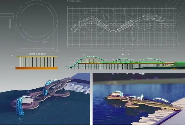 — Если говорить о его реальном воплощении, то это будет несложно. Сама по себе конструкция очень лёгкая, хотя там есть сваи, которые нужно вбить в грунт. Сверху уложить палубную террасную доску. В качестве крыши предусмотрел металлическую конструкцию с тентовой системой. «Драконий гребень» можно сделать из специальной влагозащитной ткани. Думаю, что получится эффектно, а футуристичное сооружение украсит собой левобережную часть города, — резюмировал архитектор.