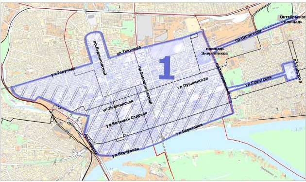 Первая зона — территория исторического центра города в границах улиц: проспект Театральный — проспект Сиверса — улица Текучёва — улица Береговая, проспект Будённовский в границах улицы Текучёва и Комсомольской площади; Театральная площадь, улица Советская в границах улицы Каяни и площади Карла Маркса, с включением территорий площади Карла Маркса, Базарной площади, площади Толстого, площади Свободы и проспекта Шолохова в границах Театрального проспекта и Октябрьской площади.