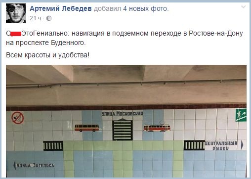 Известный дизайнер Артемий Лебедев похвалил мозаичную навигацию в переходе на Будённовском в Ростове. На своей странице в Facebook он опубликовал несколько фотографий мозаики, снабдив лаконичным комментарием: «Это гениально: навигация в подземном переходе в Ростове-на-Дону на проспекте Будённого. Всем красоты и удобства!»