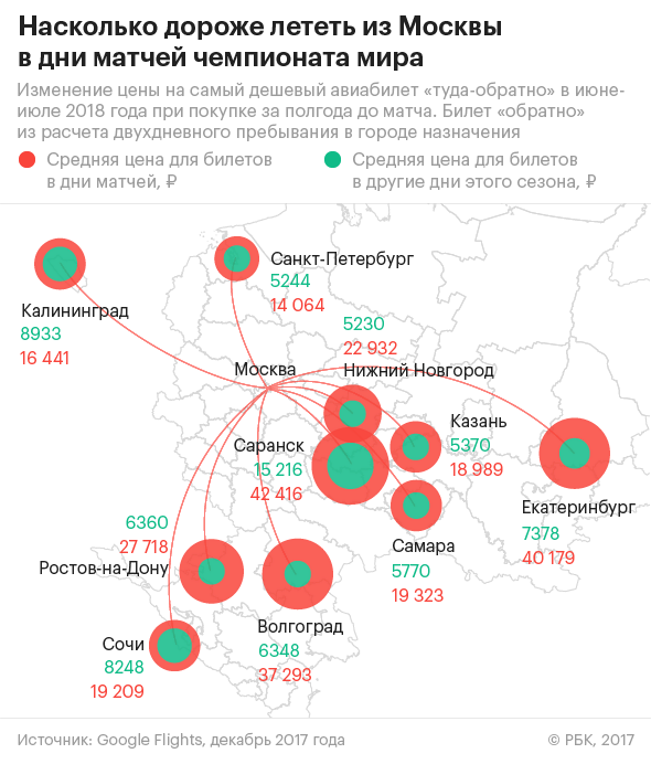 При этом Ростов в этом списке ещё не самый дорогой город. Больше всего перелёты на время матчей ЧМ-2018 подорожали в Волгограде (в 5,3 раза), в Екатеринбурге (в 4,2 раза) и Нижнем Новгороде (также в 4,2 раза). Чтобы попасть в Сочи из Саранска и вернуться обратно 22–24 июня, придётся заплатить больше 80 тысяч рублей. За такие деньги в те же даты можно слетать в Токио. Авиабилеты из Самары в Екатеринбург с 7,5 тысяч рублей подорожали до 20-40 тысяч. За эти деньги можно трижды слетать в Израиль.