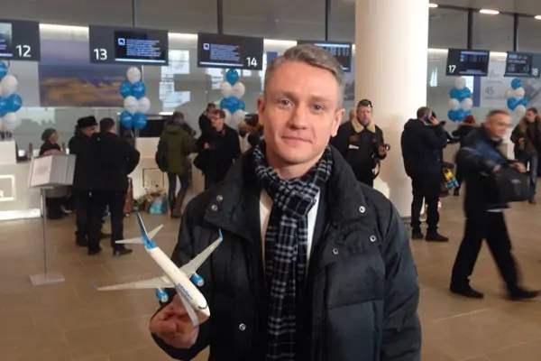 Первого пассажира, зарегистрировавшегося на первый рейс из Платова, зовут Василий. За то, что приехал первым, он получил памятные подарки.