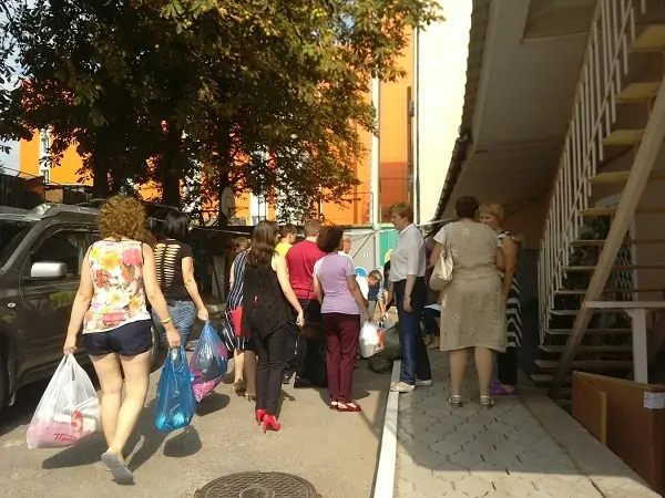У школы №22 на Театральном проспекте с раннего утра было многолюдно. Ростовчане возили сюда гуманитарную помощь (официально её принимают на Варфоломеева 99), а погорельцы ждали выплаты материальной помощи от мэрии.