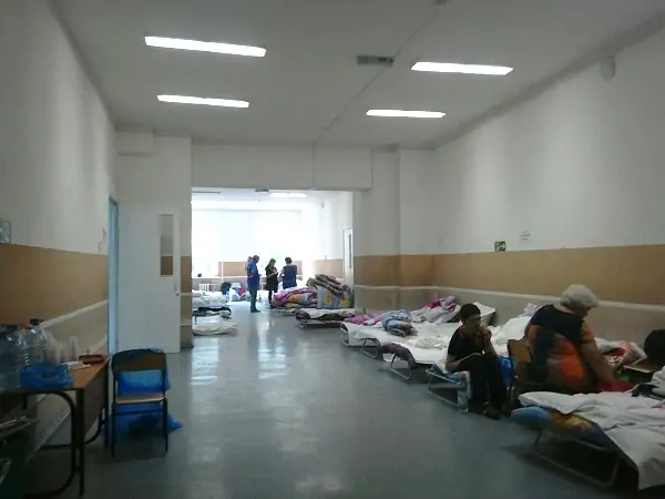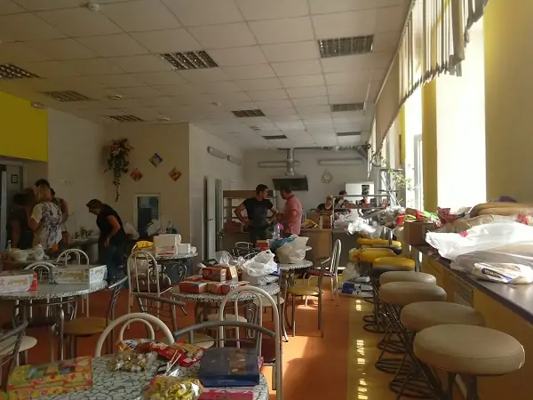 Внутри здания работают психологи и волонтёры, в спортзале расположена спальня, которая может принять до сотни человек, а в столовой — разнообразная еда и питьевая вода, которую всю ночь несли для погорельцев жители города.