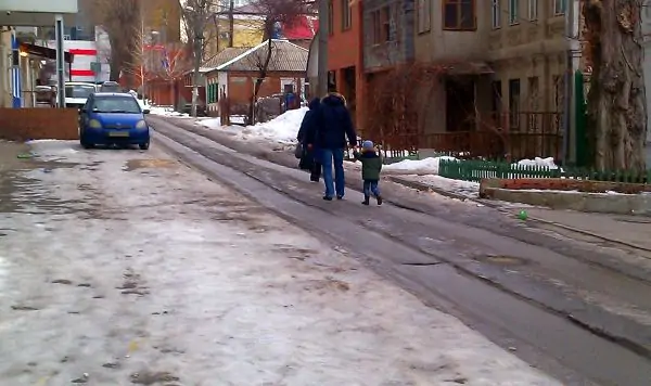 Объезжая пробку, машина сворачивает с Благодатной на Мадояна и опять оказывается на чистой дороге. Однако опять же не стоит забывать о пешеходах. Тротуары у роддома № 5 покрыты толстым слоем наледи, и людям приходится изощряться, чтобы не упасть.