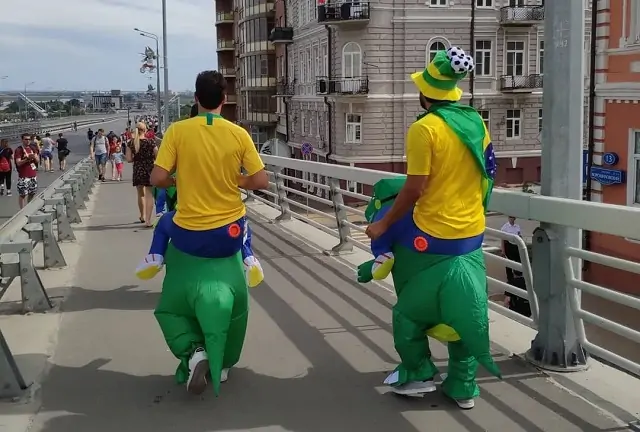19։14. Бразильцы идут к стадиону (или едут) на динозаврах. Они почти такие же старые, как защита сборной России.