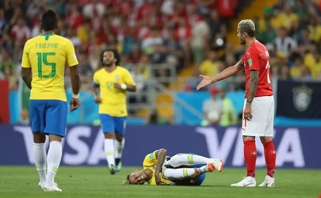 28-я минута. Неймар по лицу получает, теперь от Лихтштайнера. Защитнику жёлтая, бразильцам — штрафной.