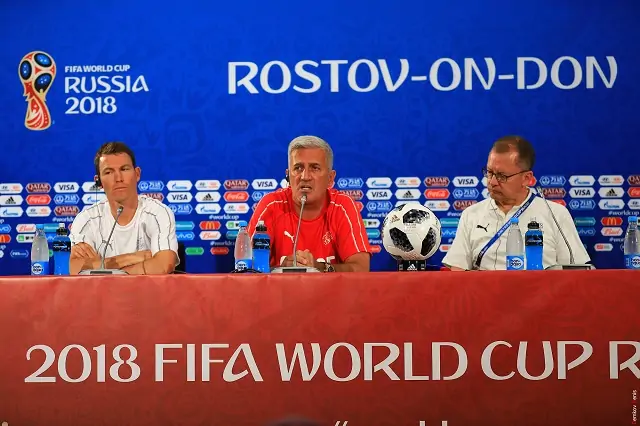 Тренировку сборной Швейцарии назначили на самое знойное время дня, когда воздух прогрелся до +35 °С. Видимо из-за этого гости приехали на пресс-конференцию не в лучшем настроении.