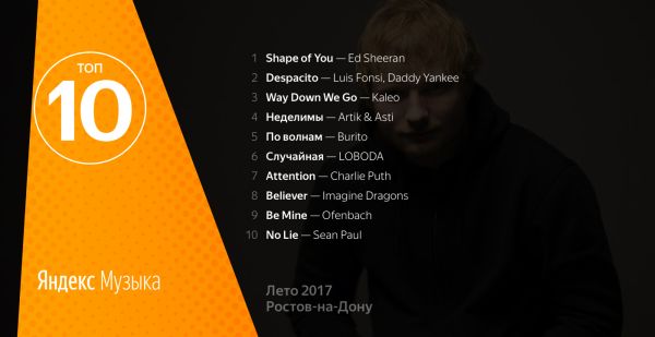 Первые три строчки топа самых популярных у жителей Ростова хитов заняли: Shape of You (Ed Sheeran), Despasito (Daddy Yanke Ft Luis Fonsi) и Way Down We Go (Kaleo).