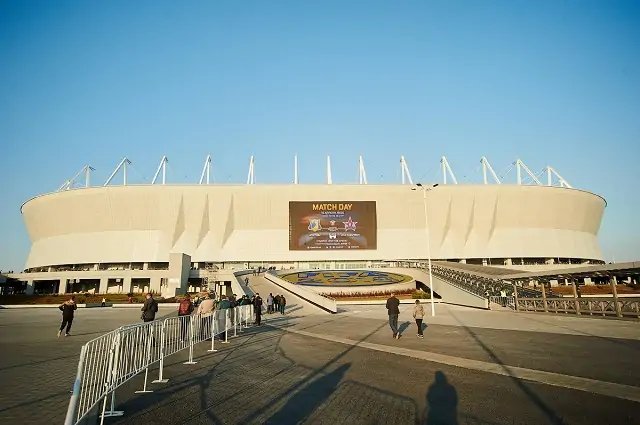 Очертания стадиона напоминают волны — именно такая форма у козырька, накрывающего зрительские трибуны. Главное отличие «Ростов-Арены» — медиафасад, на котором установлено 54 тысячи светодиодных светильников. Изображение на фасаде ночью смотрится очень эффектно.