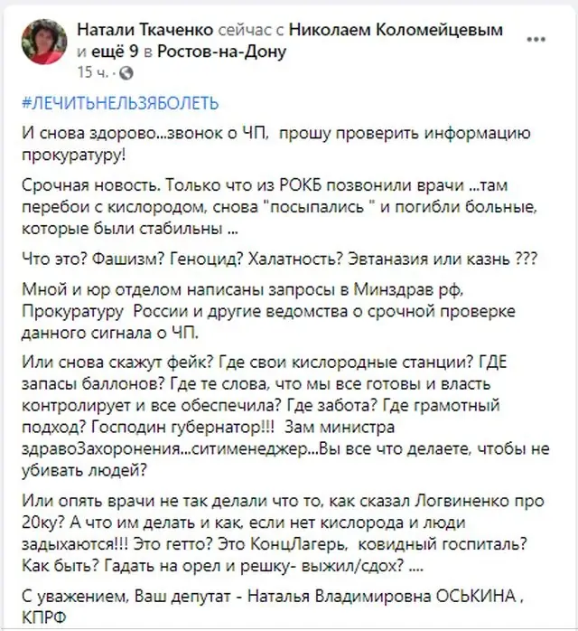 Депутат городской думы Ростова Наталья Оськина обратилась в Генеральную прокуратуру РФ и Минздрав России с просьбой проверить информацию о перебоях с кислородом в ковидном госпитале на базе Ростовской областной больницы (РОКБ). На своей странице в Facebook депутат сообщила о звонке медиков из этого госпиталя.