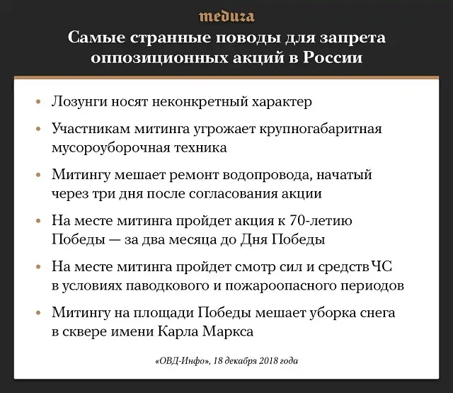 Правозащитный медиа-проект ОВД-Инфо опубликовал доклад «Искусство запрещать» о том, по каким причинам российские власти отказывают в согласовании протестных акций.