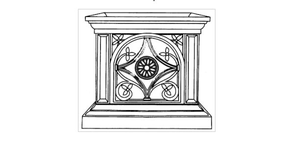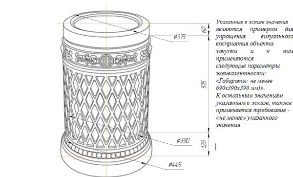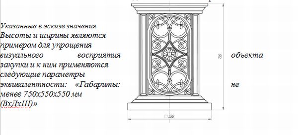Согласно документации, урны планируется закупить трёх видов. Так, планируется приобрести 78 четырёхгранных высоких урн в комплекте с ведром, вместимостью не менее 75 литров. Урна представляет собой параллелепипед, собранный из шести литых чугунных элементов, соединённых винтами, и выполнена в стиле русского классицизма. На четырёх гранях присутствует декоративный цветок, заключённый в ромб с вогнутыми к центру сторонами, с дополнительным флористическим орнаментом. Весь комплекс орнамента заключён в круглую арку с дополнительными украшениями в верхних углах. Урна внизу имеет широкий подиум, переходящий в колонны, которые в верхней части переходят в арабеску. Весь рельефный орнамент выполнен на чугунном сплошном квадрате.