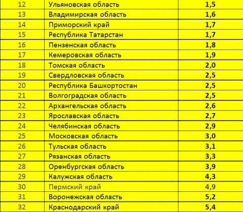 В «жёлтую» зону вошли Ульяновская, Владимирская, Пензенская, Кемеровская, Томская, Свердловская, Архангельская, Ярославская, Челябинская, Московская области, Приморский край и ещё десяток областей.