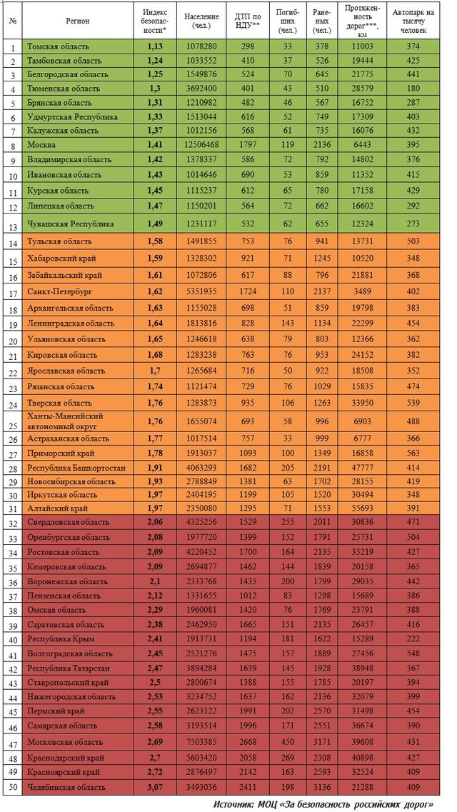 Всего в рейтинг вошли 50 регионов с населением более одного миллиона человек. Все регионы эксперты разбили на три зоны: зелёную — с удовлетворительной дорожной безопасностью, жёлтую — с недостаточной безопасностью и красную — с высокой дорожной опасностью. При составлении рейтинга аналитики центра брали в расчёт количество аварий, произошедших из-за плохих дорог, общую протяжённость автодорог в субъекте и количество зарегистрированных там машин, а также статистику смертности в ДТП.