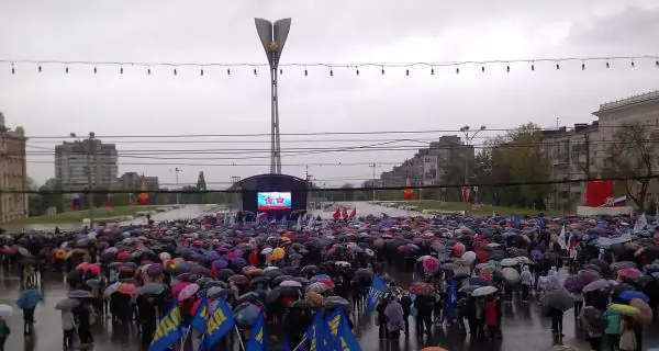 Для массового исполнения «Дня Победы» певцов в Ростов привезли со всей Ростовской области. Вдоль дорог, на подходе к Театральной площади, выстроились сотни автобусов из Донецка, Гукова, Милютинского района, Волгодонска и так далее.