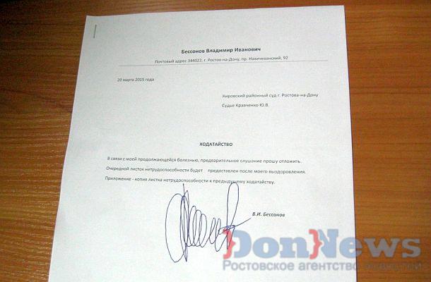 Заседание суда в Ростове продлилось не более десяти минут. За это время было зачитано ходатайство Владимира Бессонова о переносе даты предварительного слушания в связи с болезнью.