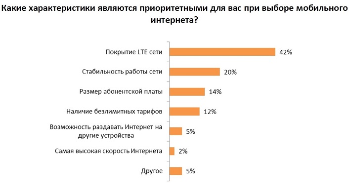 Исследование также выявило предпочтения абонентов при выборе оператора связи. Для большинства пользователей важным оказалось покрытие сетями LTE (42%) и стабильность работы (20%). Примечательно, что только 2% абонентов обращают внимание на скорость загрузки данных.