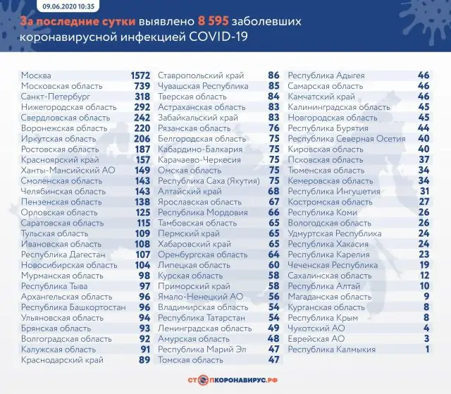 В России число заразившихся достигло 485 253 человек. За сутки эта цифра выросла сразу на 8595. За последние 24 часа в России скончался 171 пациент. Всего по стране с начала эпидемии зафиксированы 6142 смертельных исхода.
