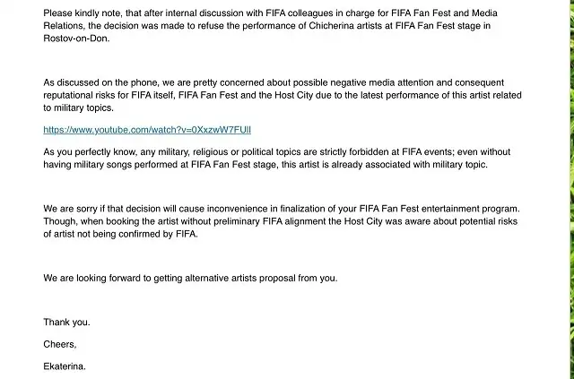 «Мы очень обеспокоены возможной негативной реакцией СМИ и рисками для репутации FIFA из-за связи исполнительницы с военной тематикой. Как вы знаете, любые военные, религиозные и политические темы запрещены на мероприятиях FIFA Даже если военные песни не прозвучат на сцене, исполнительница уже ассоциируется с военной темой. Бронирование выступления артиста без предварительного согласия FIFA чревато потенциальным риском неодобрения со стороны организации», — говорится в письме.