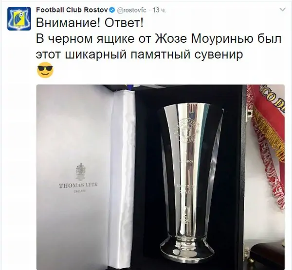 Внутри коробки оказался памятный серебряный кубок с выгравированной на нём символикой «Манчестер Юнайтед», «Ростова», Лиги Европы и сезона 2016/17, в котором прошли матчи клубов.
