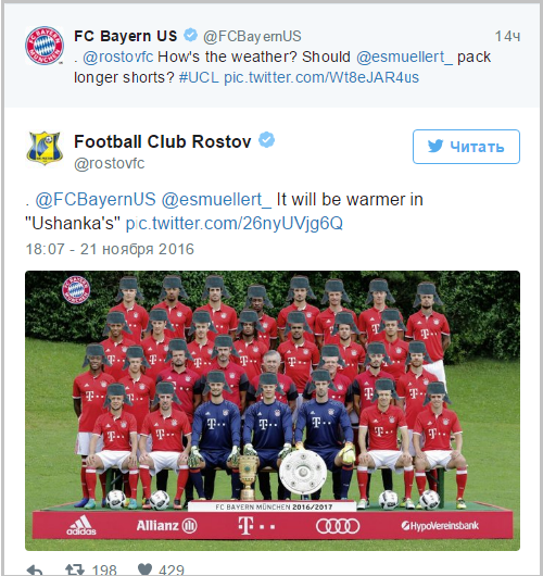 Ростовский футбольный клуб ответил, что «в ушанках будет теплее», подкрепив твитт фотографией мюнхенского клуба в шапках-ушанках.