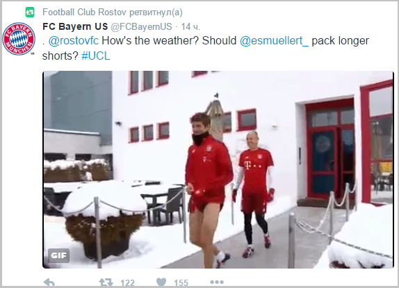 Все началось с того, что ФК «Бавария» на своей официальной странице в Twitter поинтересовались у ростовской команды о погоде в день матча, написав, стоит ли игроку «Баварии» Томасу Мюллеру надеть шорты подлиннее. Публикацию немецкая команда подкрепила гиф-картинкой, на которой Мюллер идёт по заснеженной улице в подвёрнутых шортах.