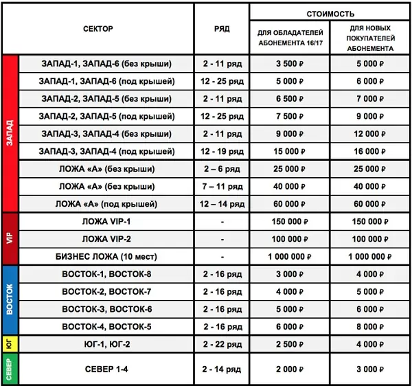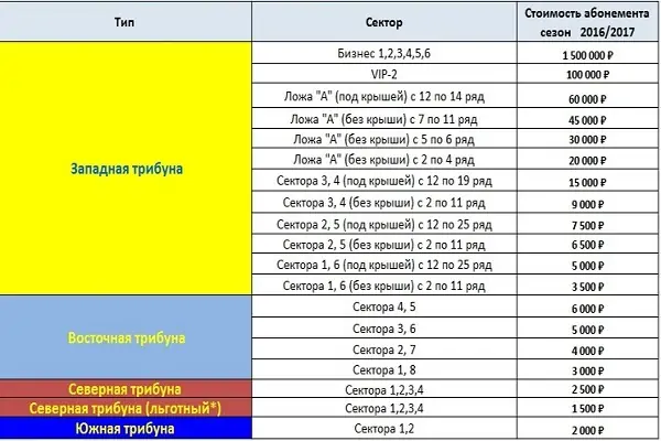 Цены на южную трибуну выросли с 2 до 4 тысяч рублей. Смотреть футбол с западной трибуны весь сезон можно будет за сумму от 6 тысяч (сектора 1 и 6) до 16 тысяч рублей (сектора 3 и 4 под крышей). В прошлом году абонементы на эти места продавались за 5-15 тысяч рублей.