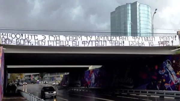«14:00! Итс э гуд тайм ту импортант футбол мэтч! Ноу ворк, ноу стади, би футбол фан! Сеньк ю, РФС», — гласила надпись на баннере, которая переводится следующим образом: «14:00! Хорошее время для важного футбольного матча. Никакой работы, никакой учёбы, будь футбольным болельщиком! Спасибо, РФС!».
