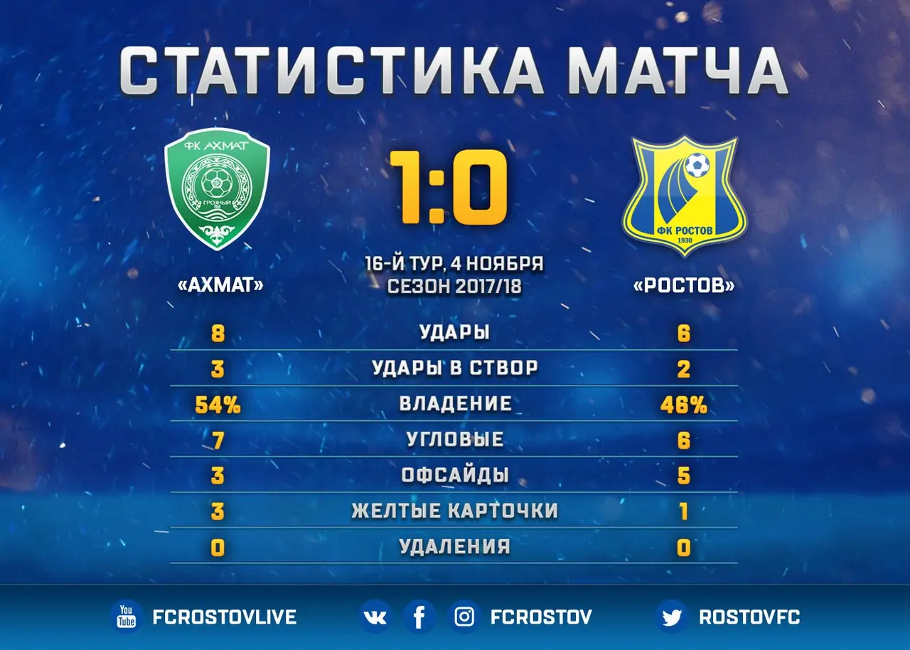 Футбольный клуб «Ахмат» из Грозного нанёс поражение ФК «Ростов». Матч 16-го тура Российской футбольной Премьер-лиги прошёл на стадионе «Ахмат-Арена» в субботу, 4 ноября.