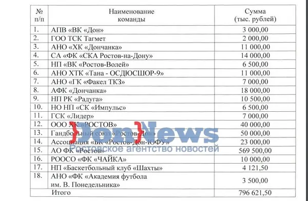 Согласно данным регионального министерства спорта, всего на субсидии для профессиональных клубов в нынешнем году было выделено 796 миллионов рублей, деньги распределили между 18 командами.