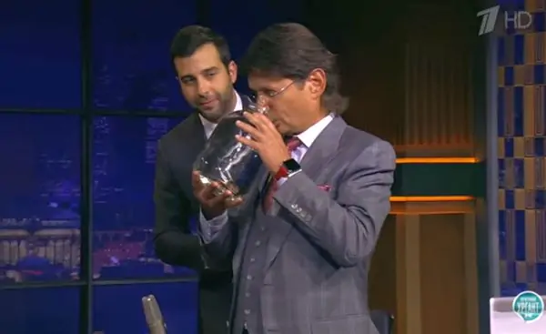 «Федун, попробуй!», — раздался голос болельщика «Спартака» из зала. Тут же на столе у Ивана Урганта появились три рюмки.