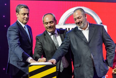 Филипп Сайяр, Александр Мацанов и Константин Мацанов жмут на символическую кнопку: новый дилерский центр считать открытым!