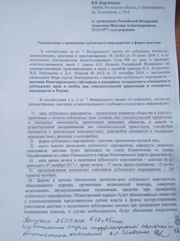 «Волгодонск, Шахты, Новочеркасск, Батайск, Азов и Таганрог стали соответственно 123-м, 124-м, 125-м, 126-м, 127-м и 128-м городами России в 80 из 85 субъектов РФ, где предприняты попытки согласовать проведение публичных ЛГБТ-акций. Ждём ответов от администраций ростовских городов. Власти Ростова-на-Дону отказали нам в проведении гей-парада и ЛГБТ-митингов в ноябре прошлого года. Это дело направлено в Европейский суд по правам человека 18 июля после прохождения всех судебных инстанций в России», — написал Николай Алексеев в соцсети.
