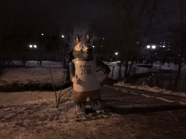 Там же находилась деревянная статуя волка Забиваки, талисмана ЧМ-2018. Интересно, что бы сделали представители ФИФА и авторы талисмана с тем, кто создал это «творение»?