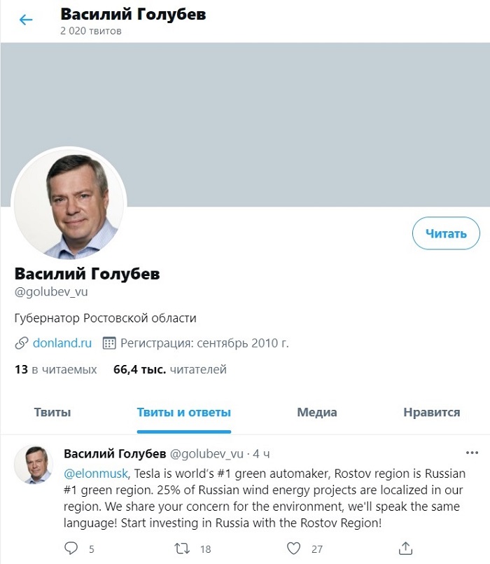 Губернатор Василий Голубев через свой аккаунт в Twitter обратился к известному бизнесмену-инноватору Илону Маску, предложив тому инвестировать в Ростовскую область. Обращение при этом составлено на английском языке.